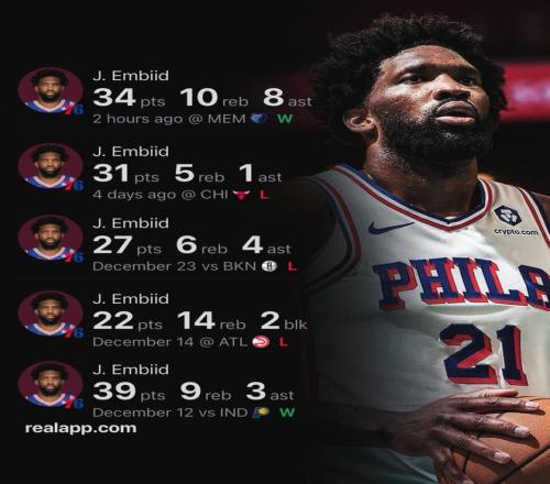 過去5場比賽,恩比德場均拿下30.6分8.8板3.4助1.4斷0.6帽,但命中率隻有47.6%,本場比賽更是恩比德本賽季首次連續兩場交出30+得分表現。