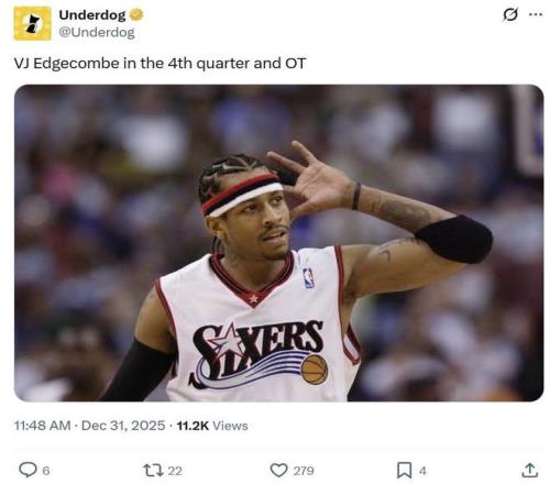 麵對埃奇庫姆這樣的表現,美媒Underdog曬出艾弗森配圖,直言:“埃奇庫姆末節與加時像極了那個男人。”