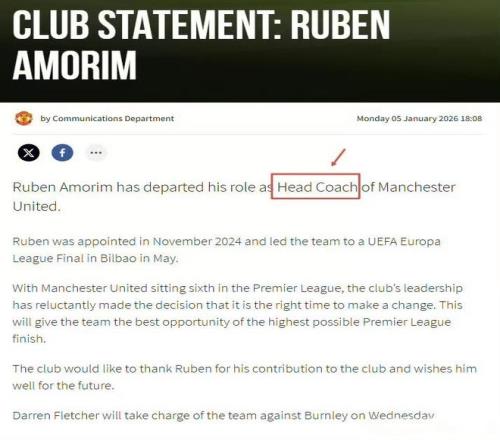 曼聯管理層在宣布阿莫林下課的公報中寫道:“曼聯目前在英超聯賽中排名第6,俱樂部高層經過深思熟慮,認為現在是做出改變的合適時機。”而且高層是用了coach而不是manager來描述阿莫林的,這也是讓他很不滿的點。看的出,高層是對他不認可的。