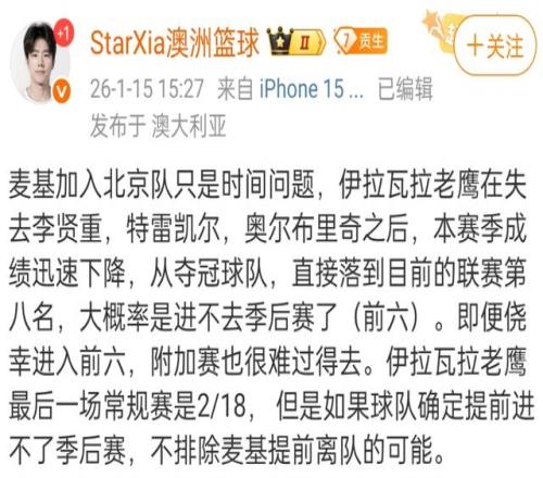北京首鋼本賽季可以說是高開低走,趙睿健康的時候,北京首鋼成績不錯,然而現在是出現了傷兵滿營的情況,趙睿、陳盈駿、斯佩爾曼先後受傷,這還不包括帶傷比賽的周琦,剛傷愈的丘天等人。根據媒體人報道,NBA名將麥基確定會加盟北京首鋼,甚至有可能在第一階段就完成簽約。
