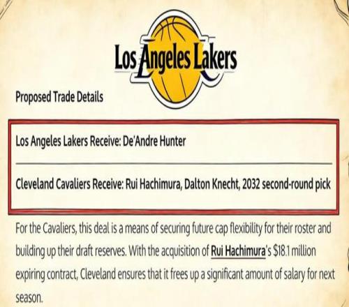 美媒《Fadeaway World》撰文建議,湖人可以考慮打包送出八村壘、克內克特以及2032年的次輪簽,從騎士引入亨特。
