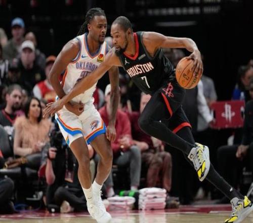 NBA常規賽,火箭坐鎮主場迎擊雷霆。本場比賽之前,火箭23勝14負排名西部第6,過去4場比賽他們輸掉3場,被開拓者雙殺,慘敗倒數第一的國王,從陣容上看,火箭真的很強,全員天賦都是頂級,聯盟平均身高最高的一支球隊,去年夏天還引進了超級巨星杜蘭特。然而,一番比賽下來卻發現,光有天賦還是不行,火箭現在的投射有點糟糕,連著幾場三分命中率都隻有兩成,再加上缺少控衛組織,他們暫時很難上升到爭冠高度。另一邊的雷霆隊,34勝7負排名西部第一,近期雷霆又轟出4連勝,他們依然是現在最有統治力的一支隊伍。