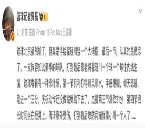 賈磊這段文字既是對老將翟曉川的誇獎,也是對北京教練組使用外援辦法的不滿,此役傑曼砍下29分,第三節轟下21分,貝利則入賬11分,北京隊內隻有3人得分上雙,另外一人是翟曉川的15分。