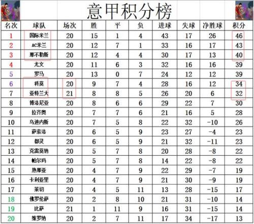 積分榜方麵,國米和AC米蘭本周中補賽都贏了球,國米還是3分優勢力壓AC米蘭領跑,那不勒斯補賽無力贏球被拉開差距,落後國米6分,少AC米蘭3分排在第3。亞特蘭大今天要是能贏球奪得4連勝的話,就能追上黑馬科莫,隻是他們最後慘遭絕平,3連勝被終止,差科莫2分暫時還是排在第7。