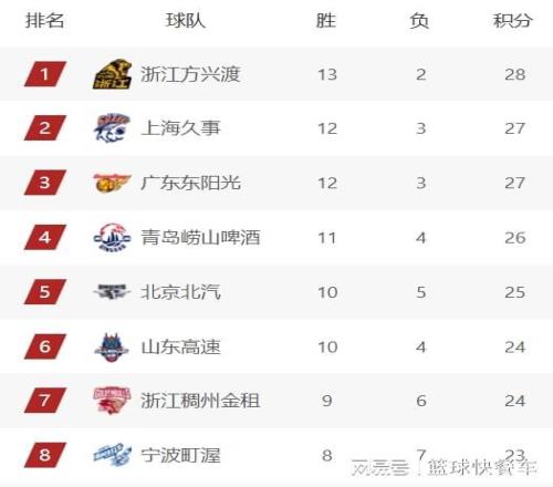 積分榜第6名則屬於山東隊,最近山東隊狀態火爆,截止到目前,他們已經豪取8連勝,球隊的戰績也變成10勝4負。不過,由於少賽一輪的緣故,山東隊的排名稍微吃虧,暫時排在積分榜第6名。而排在第7名的是浙江隊,他們的戰績是9勝6負。積分榜第8名則屬於寧波隊,作為本賽季的黑馬之一,寧波隊目前已經拿到了8勝7負的戰績,暫居積分榜第8名,這與他們上賽季的表現比起來,已經提升了不止一個檔次。