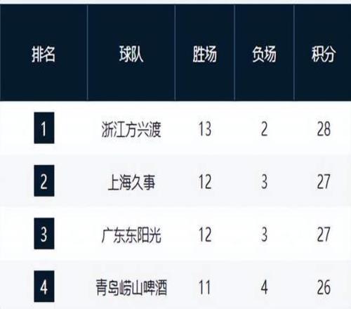 積分榜前三名依舊由廣廈、上海和廣東三隊把持。衛冕冠軍廣廈隊憑借一波4連勝,以13勝2負的戰績獨占鼇頭,領先廣東隊1個勝場。上海隊以12勝3負的戰績緊隨其後,位列第2名。廣東隊則在上一輪40分慘敗給上海隊後,戰績同為12勝3負,但因交鋒戰績劣勢暫居第3名。