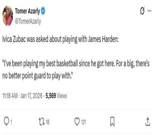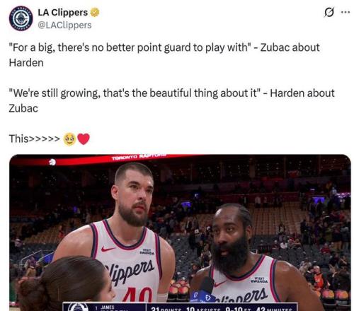 賽後祖巴茨也點名感謝哈登:“自從哈登加盟以來,他幫助我打出最好的籃球,對於大個球員來說,沒有比他更好的控衛了。”