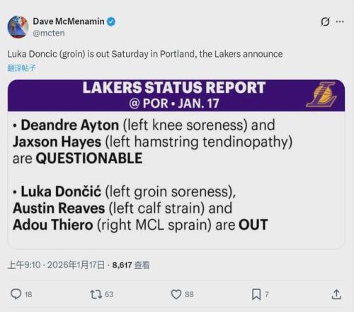 北京時間1月17日上午9點,湖人官方公布球隊傷病報告:東契奇(腹股溝酸痛)、裏夫斯(左小腿拉傷)、蒂耶羅(右膝韌帶扭傷),將缺席明天和開拓者的比賽。此外,艾頓(左膝酸痛)和海斯(左腿筋肌腱炎)均是出戰成疑。