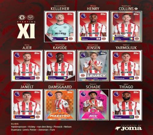 布倫特福德首發:1-凱萊赫、33-卡約德、22-內森-科林斯、3-裏科-亨利、20-阿耶、18-亞爾莫柳克、24-達姆斯高、27-雅內爾特、8-延森、9-伊戈爾-蒂亞戈、7-沙德