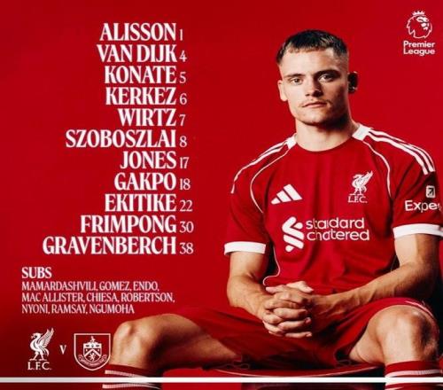 利物浦首發:1-阿利鬆、30-弗林蓬、5-科納特、4-範戴克、6-凱爾凱茲、38-赫拉芬貝赫、17-柯蒂斯-瓊斯、7-維爾茨、8-索博斯洛伊、18-加克波、22-埃基蒂克