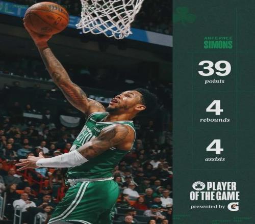 除此之外,新援安芬尼-西蒙斯的表現也能大吹特吹,勢頭直奔最佳第六人獎項,本賽季至今出戰40場全部替補,場均上陣24.3分鍾,貢獻14.1分2.4板2.6助,場均以40.5%命中率扔進2.7記三分球,當今凱爾特人最重要的第二陣容火力輸出點。