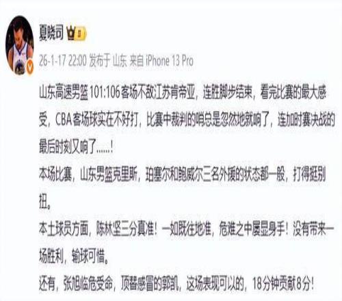 作為山東媒體人,夏曉司老師是會這樣說的,“看完比賽的最大感受,CBA客場球實在不好打,比賽中裁判的哨總是忽然地就響了,連加時賽決戰的最後時刻又響了……”顯然,他覺得是裁判的問題。