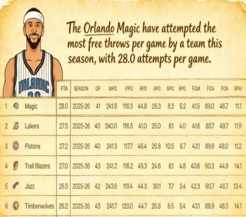 魔術場均罰球聯盟最多,是因為他們的內線優勢,瓦格納和班切羅都有出色的低位進攻技術;湖人罰球多,是因為東契奇、裏夫斯、詹姆斯出色的造犯規能力;活塞是因為坎寧安、杜倫領銜的青年軍在前場的超強衝擊力。
