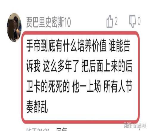 “手帝打成這樣,還用,就不能上虎子何大牙?楊鳴水平呀”;“手帝到底有什麽培養價值 誰能告訴我 這麽多年了 把後麵上來的後衛卡的死死的 他一上場 所有人節奏都亂”……
