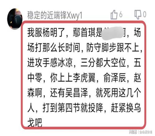 賽後,許多遼寧球迷也紛紛吐槽“手帝”。“我服楊嗚了,鄢手琪場場打那麽長時間,防守腳步跟不上,進攻手感冰涼,你上上李虎翼,俞澤宸啊,還有吳昌澤,就死用這幾個人,打到第四節就投降,趕緊換烏戈吧”;“把鄢手騏焊場上了,一副無所謂的樣子看著就煩,有他在,遼寧不帶好的”;“輸了,香蕉视频网址認,但是,楊導,如果讓手帝這麽浪投下去,不如讓代彥龍,他們這些孩子上來打打。”。