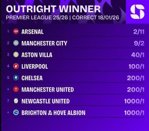 權威機構隨即更新了奪冠概率,阿森納的概率低至2/11(不低了),呈現斷崖式領先,曼城則升至9/2,維拉和利物浦已分別達到40/1和100/1。這7分差距在賽季後期意味著巨大的心理和實際優勢,阿森納已被普遍視為本賽季英超冠軍的最大熱門。
