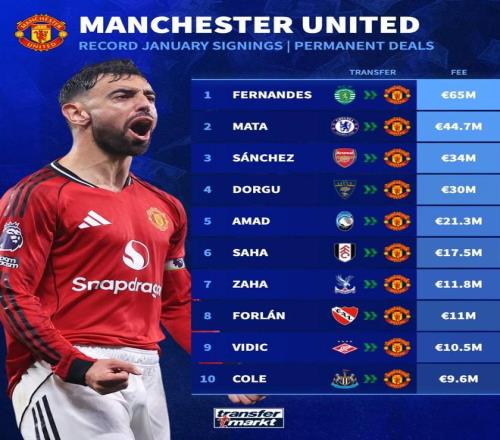 北京時間1月19日,德轉統計出了曼聯隊史冬窗最貴的10筆引援,布魯諾-費爾南德斯6500萬歐元高居第一,馬塔4470萬歐元第二,桑切斯3400萬歐元第三。