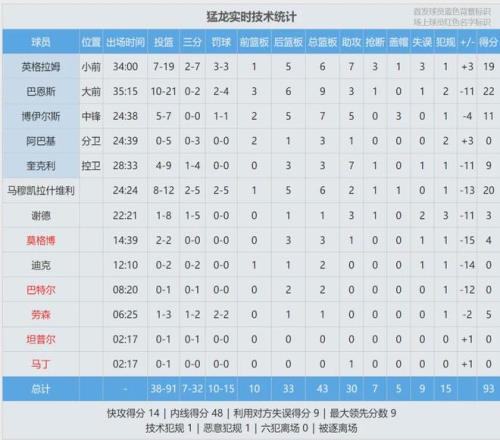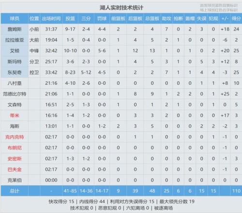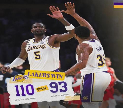 全場結束,湖人110-93大勝猛龍,下一場後天打掘金。東契奇25分2板7助、詹姆斯24分4板7助2帽。艾頓10投10中,怒砍25分13板,正負值+20僅次於範德彪(+25)。巴恩斯22分9板、馬穆20分6板、英格拉姆19分6板7助3斷。