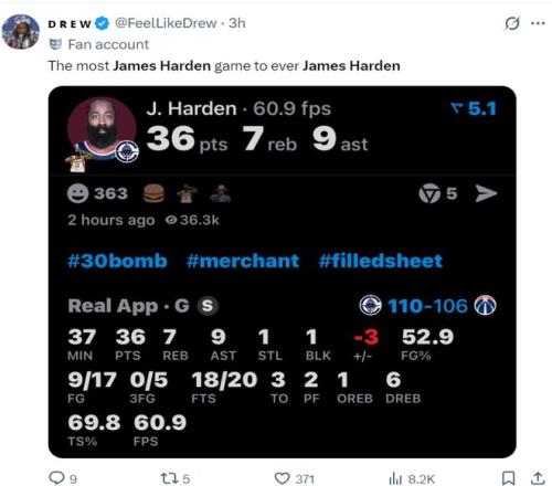 對陣奇才的這場比賽,哈登37分鍾,17中9,罰球18中20,拿到36分9助攻7籃板1搶斷1蓋帽,命中率52.9%,真實命中率69.8%,他又打出了全麵的表現。