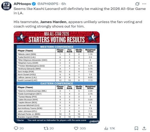 北京時間1月20日,NBA官方公布了最終的全明星球迷投票,快船的萊昂納德561253排在第13,快船的哈登599911排在第12。