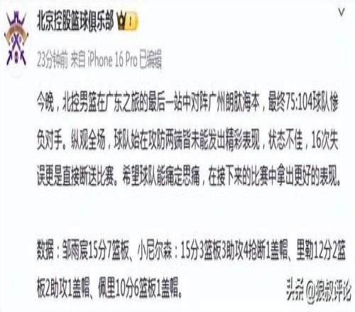 北控男籃在廣東之旅的最後一站中對陣廣州朗肽海本,最終75:104球隊慘負對手。縱觀全場,球隊始終在攻防兩端皆未能發出精彩表現,狀態不佳,16次失誤更是直接斷送比賽。希望球隊能痛定思痛,在接下來的比賽中拿出更好的表現。