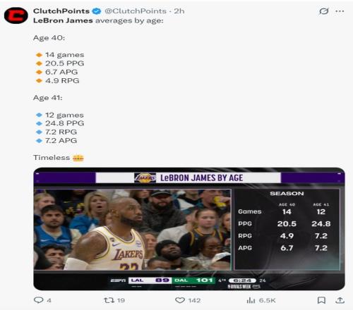 轉播方也還出,詹姆斯40歲的14場比賽場均20.5分6.7籃板4.9助攻,但41歲的12場比賽場均24.8分7.2籃板7.2助攻,老詹還在進步。