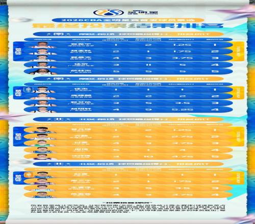 北京時間1月26日,CBA官方公布2026年全明星賽首發陣容,徐傑以1,654,042票當選南區票王,並且連續兩年蟬聯總票王成為曆史第4人,南區首發5人分別是賀希寧、胡金秋、郭昊文、徐傑、龐崢麟;趙睿以1,280,443票當選北區票王,北區首發5人分別是曾凡博、齊麟、付豪、趙睿、廖三寧。