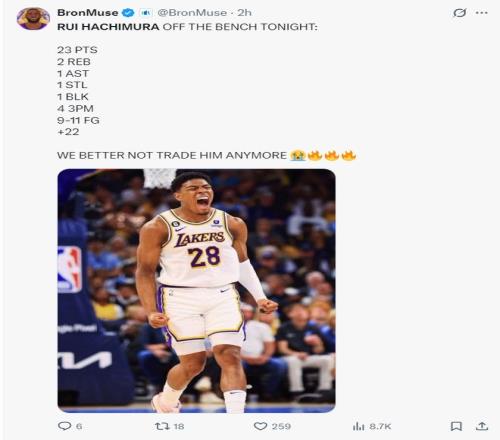 湖人媒體:此役打完後大家覺得八村是否值得球隊長期留用?還是說湖人該在交易截止日前利用他的合同進行交易換取更好的球員?還是繼續留著跟他續約?