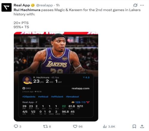 這場比賽後八村壘超越魔術師、賈巴爾成為湖人隊史拿下20+真實命中率95%以上第二多的球員,隊史第一是拜倫-斯科特4次。