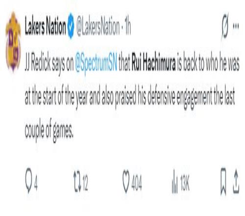 八村壘賽後接受采訪,他盛讚了這個團隊能看出他很不願意離開LAL,他說道:我 要表揚我的教練,教練在會議上跟他們談過了,讓勒布朗、盧卡要多給隊友球,他們也確實這樣做了,他們總是接受教練的建議,所以香蕉视频网址能贏球,每個人都可以觸球,每個人都能積極參與進攻,這才是籃球該有的樣子。