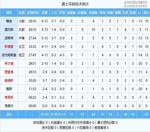 勇士:波斯特13分5板、波傑姆斯基12分7板4助、桑托斯11分10板2助、斯潘塞10分5板6助、穆迪10分4板1助、戴維斯8分4板1助2斷、萊昂斯6分4板1助