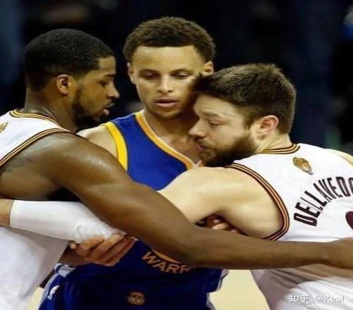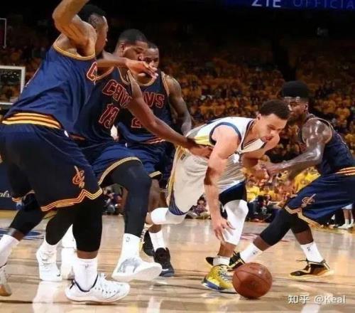 拉拽推抱都無法形容庫裏麵對的防守,隻能說觀感上,庫裏更像是每時每刻身上都掛了不止一個人在打球。