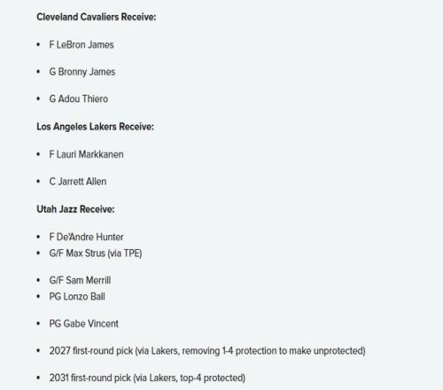 爵士得到:亨特、斯特魯斯、梅裏爾、朗佐-鮑爾、文森特、湖人2027年首輪簽(移除前四順位保護,變為無保護簽)、湖人2031年首輪簽(前四順位保護)
