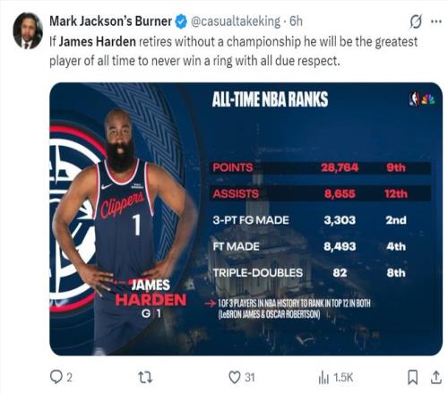 美媒寫道:如果哈登生涯結束時依舊沒有拿到總冠軍,那麽無論從哪方麵考慮,他都是有史以來最偉大的無冕之王,在此我要表達崇高的敬意。