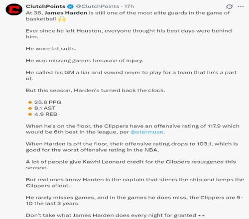 美媒Clutchpoints寫道:36歲的哈登依舊是籃球界最頂尖的後衛之一,本賽季的哈登場均25.6分8.1助攻4.9籃板,當他在場時快船進攻效率達到117.9排在聯盟第六,而當哈登下場時快船進攻效率下滑到103.1聯盟倒數之一,哈登在場/不在場進攻效率差值高達14.8。