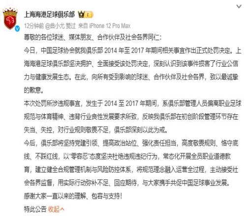 周四,中國足協正式公布受處罰俱樂部名單,上海申花、上海海港兩家俱樂部公開道歉。