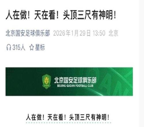 緊接著了,北京國安在官微上發文:“人在做,天在看!頭頂三尺有神明!”。此舉欲言又止,大有想說什麽又什麽都沒說的味道。
