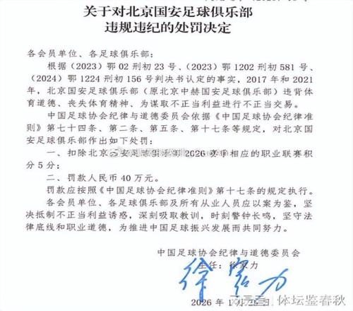 當時,俱樂部在個別事項上存在明顯偏離職業足球基本準則的行為,在競技層麵之外,試圖通過不正當方式獲取額外利益,這種操作既違背了體育道德,也觸碰了行業底線。基於這些問題,中國足協對北京國安作出了明確的處罰決定,新賽季相應職業聯賽積分被扣除5分,同時處以40萬元的罰款。