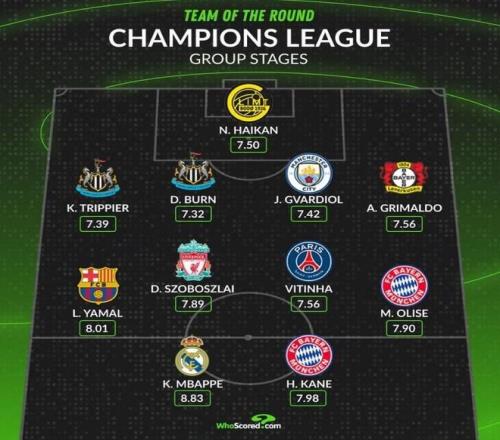 伴隨著歐冠聯賽階段戰罷,權威數據網站Whoscored評選出了一份瑞士輪聯賽階段場均評分最高的陣容。該數據網站致力於賽後球員評分,所參考的數據是綜合性的,因此這套最佳陣容非常的合理。