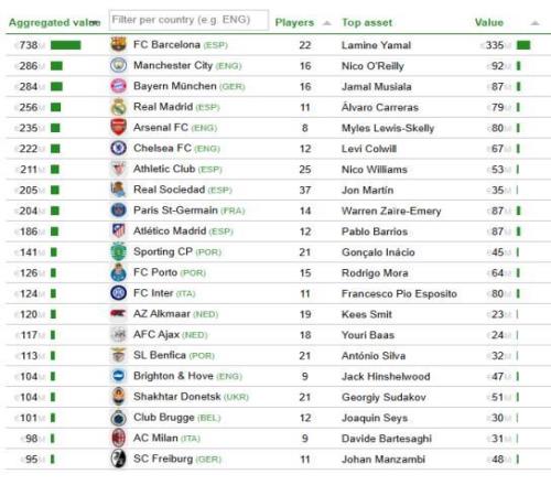 憑借亞馬爾、庫巴西、費爾明、奧爾莫、巴爾德、埃裏克-加西亞、卡薩多、貝爾納爾以及加維等一眾球員的出色表現,巴薩以6.4億英鎊(約7.38億歐元)的青訓球員總身價高居榜首。