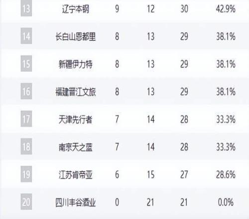 遼寧隊作為四冠王,戰績滑落至9勝12負,排名跌至第13位,賽季表現遠低於預期。福建隊、新疆隊、吉林隊同為8勝13負,陷入中遊泥潭。同曦隊(7勝14負)、天津隊(6勝15負)、江蘇隊(5勝16負)與四川隊(0勝21負)則深陷倒數深淵,其中四川隊已遭遇21連敗,創CBA曆史最差開局紀錄。