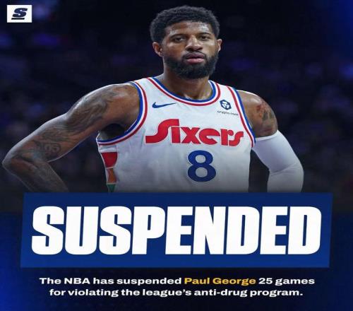 NBA官方宣布,76人隊前鋒保羅·喬治因違反聯盟禁藥規定,被禁賽25場。本賽季,保羅·喬治出戰27場,場均得到16分5.2籃板3.7助攻1.5搶斷0.5蓋帽。