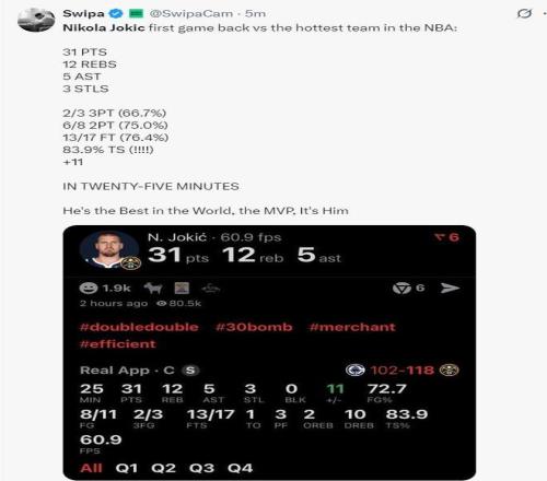 約基奇的複出無疑是本場最大的看點,在經曆了一段時間的休戰後,他迅速找回了比賽影響力,他在內線的進攻選擇多樣,無論是麵對祖巴茨的籃下強攻,還是高位策應尋找空切隊友,都處理得相當高效。