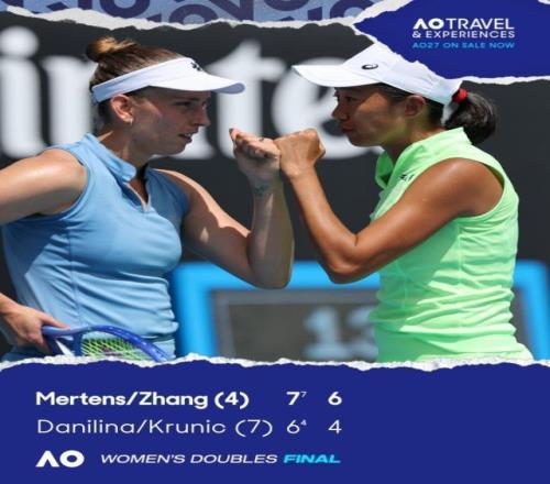 2026年澳網女雙決賽,4號種子張帥/梅爾滕斯7比6(4) 6比4擊敗7號種子達尼麗娜/克魯尼奇。這是張帥/梅爾滕斯搭檔第一次贏得大滿貫冠軍,也是37歲張帥摘得的第三座大滿貫雙打冠軍!她們將獲得81萬澳元(折合人民幣約392萬元)冠軍獎金。首盤比賽,張帥組合在1比4落後情況下,連贏4局,最終通過搶七以7比6(4)拿下第一盤。第二盤,張帥組合在5比0領先的情況下,兩次錯失冠軍點,被對手追成5比4,最終張帥組合在第三個發球勝賽局勝出。張帥繼2019年澳網搭檔斯托瑟收獲生涯大滿貫首冠後,再度斬獲澳網女雙冠軍。