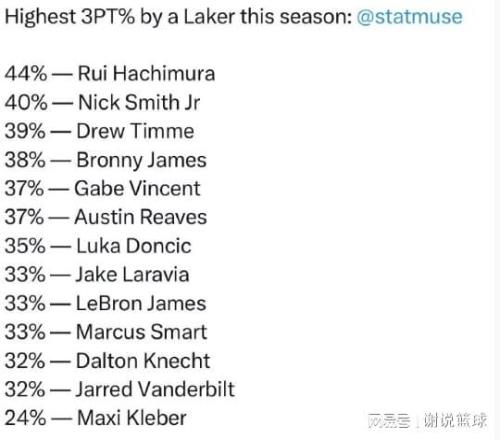 詹姆斯在拉拉維亞之後,其實放眼湖人主要輪換球員,隻有四位三分命中率比他低。這其中包括斯瑪特、克內克特和範德比爾特,當然最離譜的還是克勒貝爾,即便經常投空位三分情況下,他依然隻有24%的命中率,實在是有些離譜。
