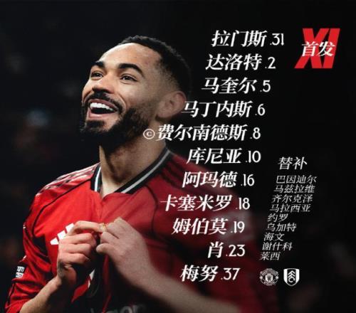 曼聯首發:拉門斯/達洛特、馬圭爾、利桑德羅·馬丁內斯、盧克·肖/卡塞米羅、梅努/阿馬德、B費、庫尼亞/姆伯莫