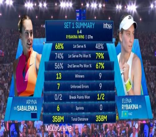第一盤比分最後定格在6比4,萊巴金娜先下一城。兩人首盤數據十分接近,但萊巴金娜在關鍵球上更勝一籌。
