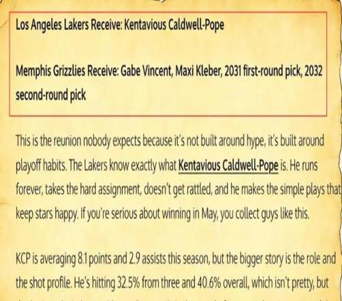 美媒《Fadeaway World》便提出了這樣一筆“小修小補”式的交易方案,他們建議湖人送出文森特、克萊伯、2031年的首輪簽以及2032年的次輪簽,從灰熊引入後衛波普。
