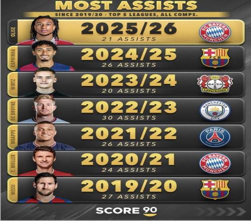最近Score90做了五大聯賽、所有賽事口徑的助攻盤點。2025/26賽季還在進行中,奧利塞這段時間的表現已經把“助攻王”的氣勢打出來了:他不隻是暫時領跑,而是用連續不斷的輸送把領先優勢先拉開,節奏也明顯更快。更關鍵的是,這種表現放到更長的時間軸裏也站得住——他已經進入近些年單賽季助攻王的序列,和那些曾經把助攻做到極致的名字並列。賽季接下來怎麽走,他能不能把這種節奏一直保持下去,是這組內容最值得關注的地方。(數據截至北京時間2026年1月25日)