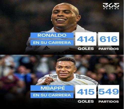 這場雙響之後,365Scores給出的對比數字很直接:羅納爾多(外星人)生涯616場414球,姆巴佩生涯549場415球。也就是說,姆巴佩在少踢將近70場的情況下,把外星人的生涯總進球追平並反超。